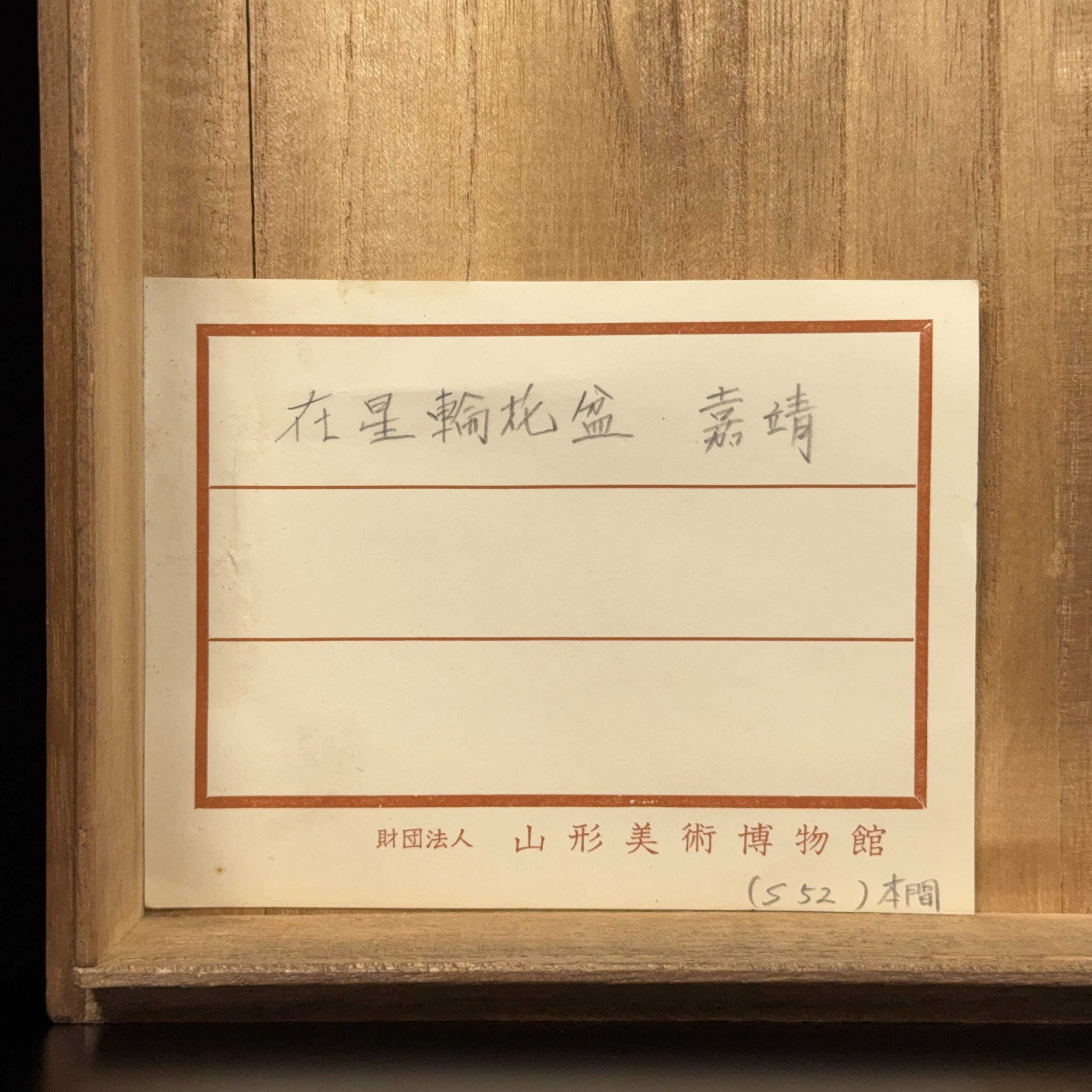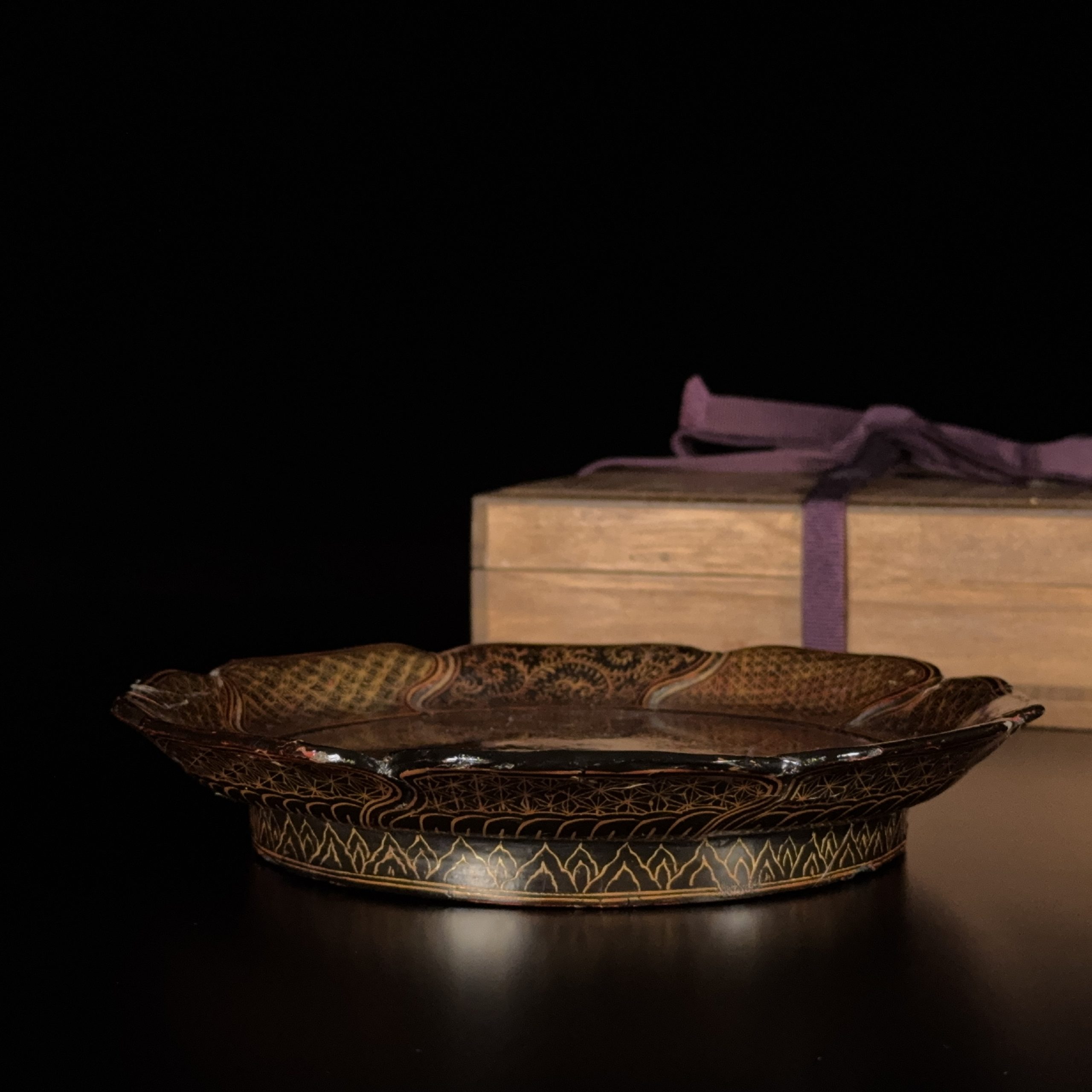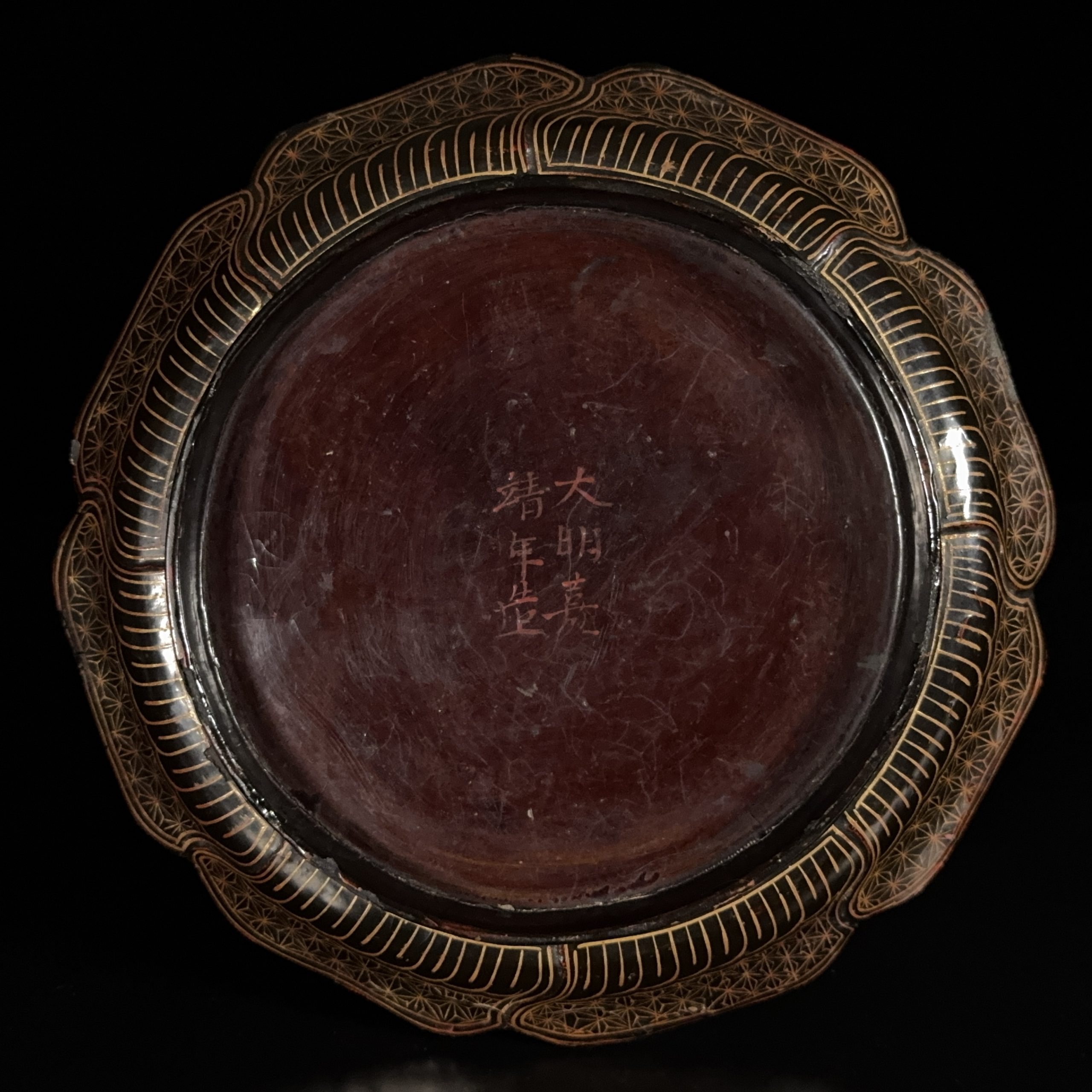 明「大明嘉靖年造」款 黒漆描金 山水紋 輪花盤