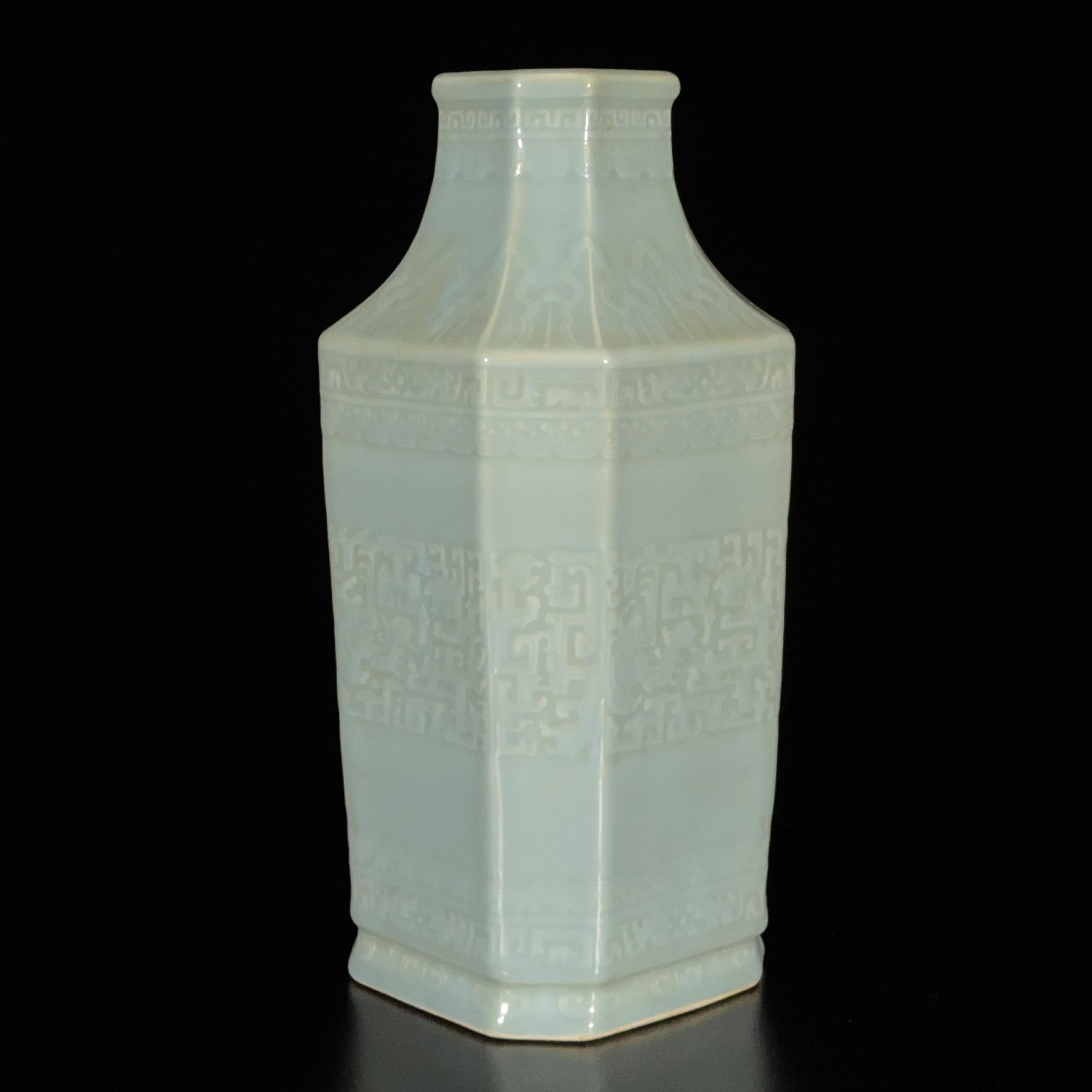 清「大清嘉慶年製」款 天青釉 饕餮紋 方瓶