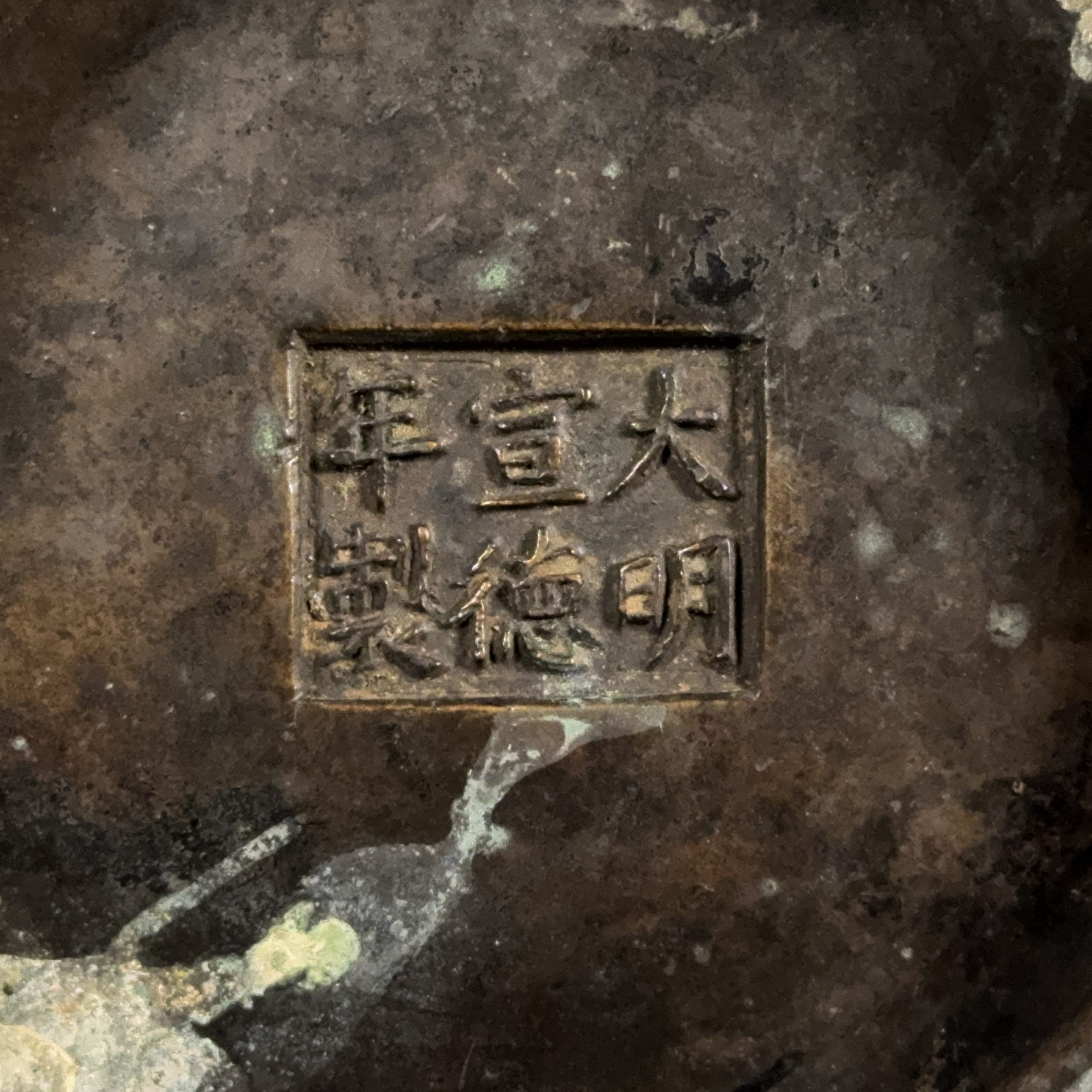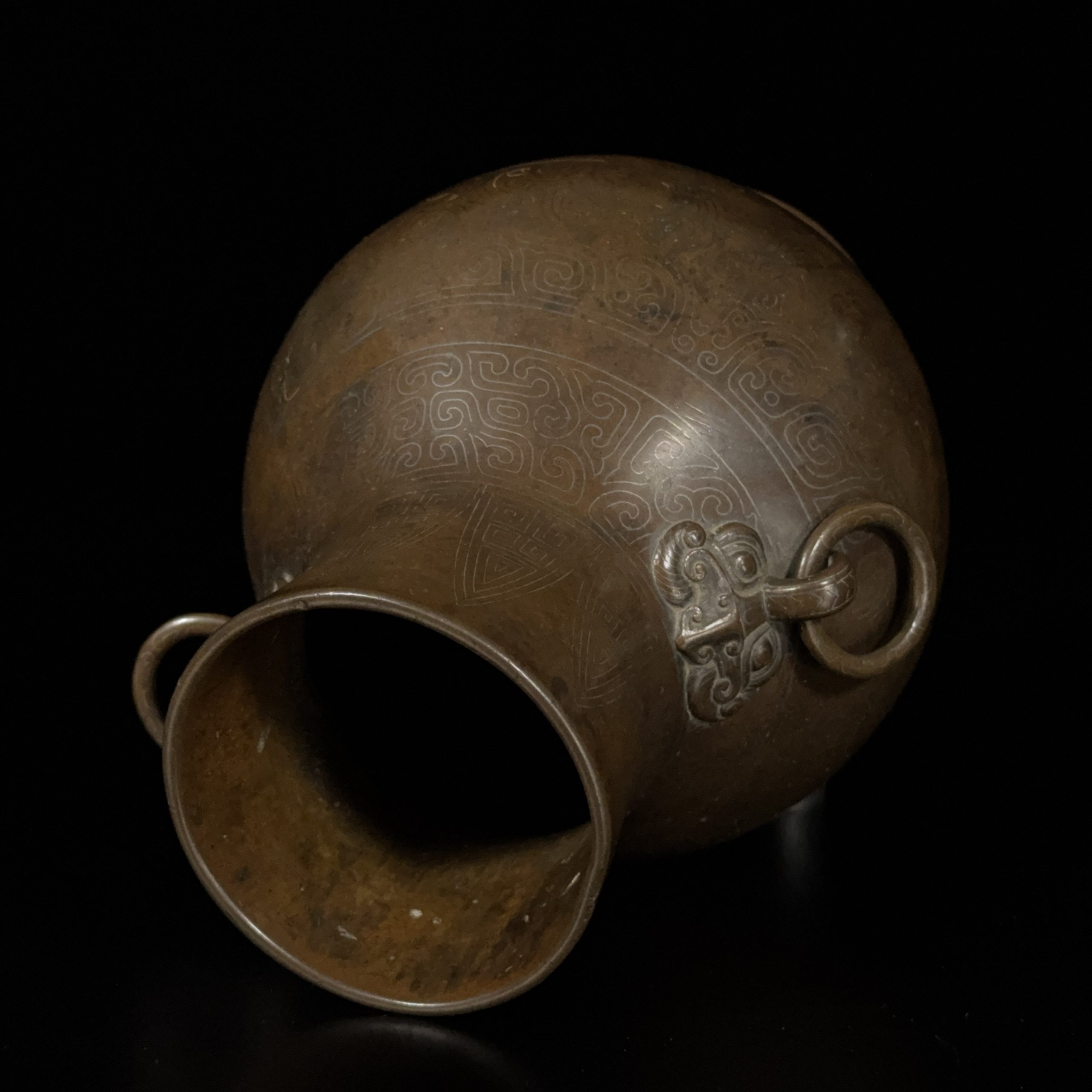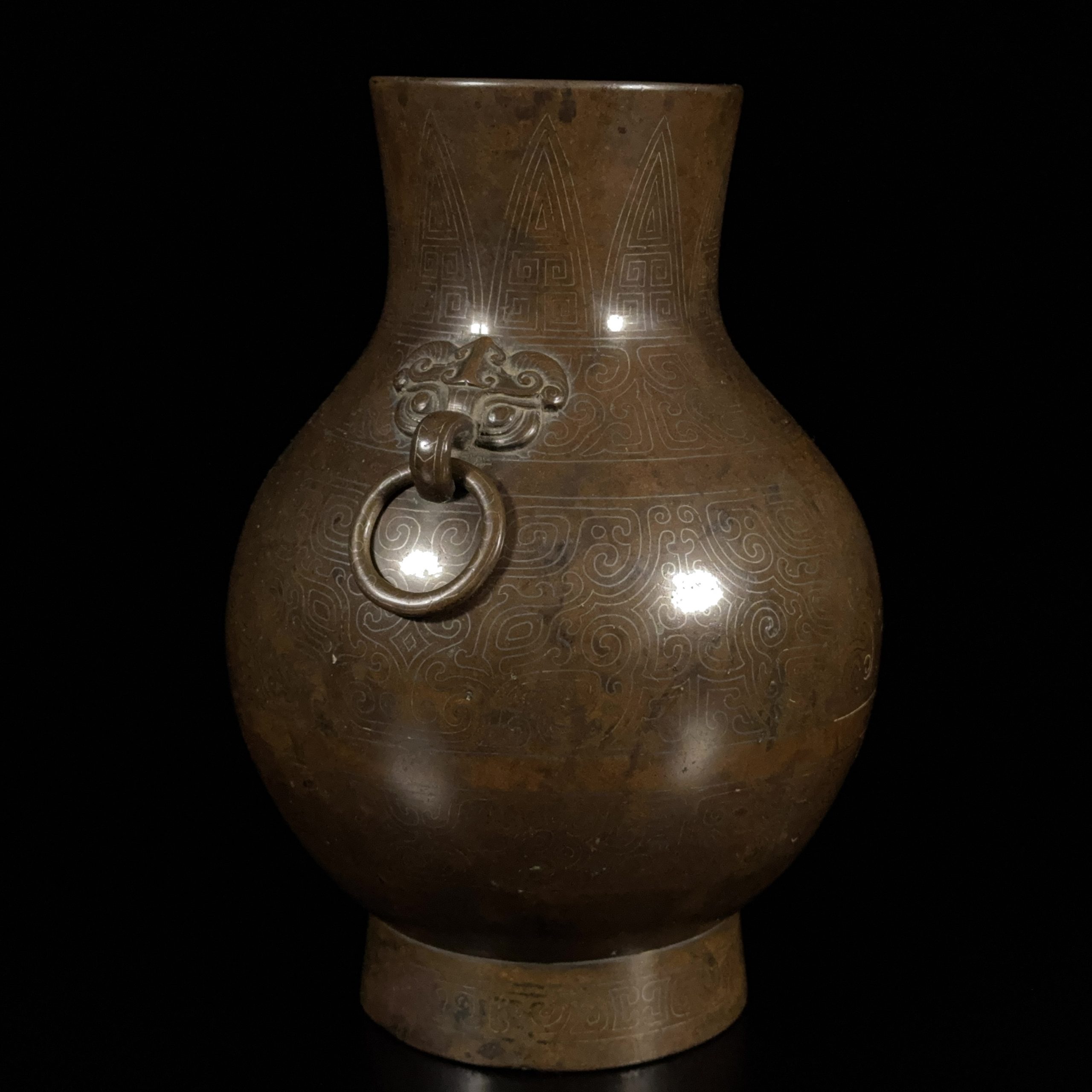 明末「大明宣徳年製」款 銅錯銀 饕餮紋 獣耳瓶